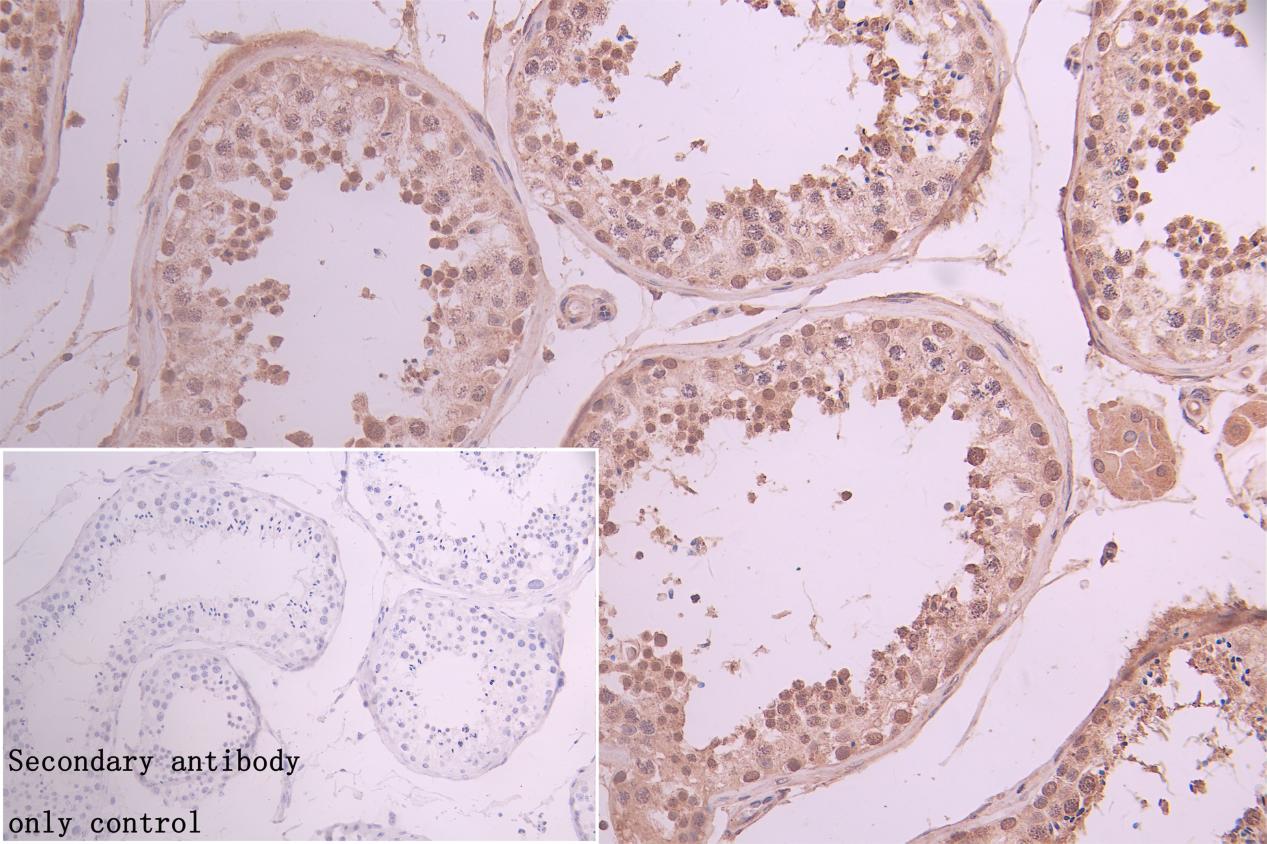 • IHC image of CSB-PA757769LA01HU diluted at 1:700 and staining in paraffin-embedded human testis tissue performed on a Leica BondTM system. After dewaxing and hydration, antigen retrieval was mediated by high pressure in a citrate buffer (pH 6.0). Section was blocked with 10% normal goat serum 30min at RT. Then primary antibody (1% BSA) was incubated at 4°C overnight. The primary is detected by a Goat anti-rabbit polymer IgG labeled by HRP and visualized using 0.05% DAB. Secondary antibody only control: uses 1% BSA instead of primary antibody