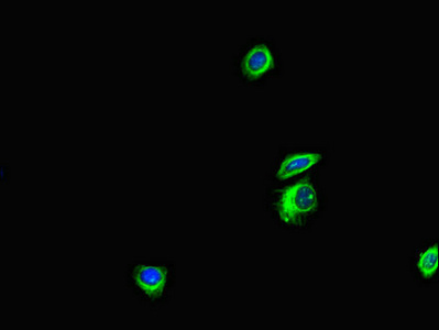 • Immunofluorescent analysis of HepG2 cells using CSB-PA718074LA01HU at dilution of 1:100 and Alexa Fluor 488-congugated AffiniPure Goat Anti-Rabbit IgG(H+L)