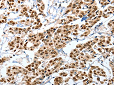 The image on the left is immunohistochemistry of paraffin-embedded Human breast cancer tissue using CSB-PA574741(ANXA10 Antibody) at dilution 1/35, on the right is treated with fusion protein. (Original magnification: ×200)