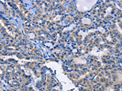 The image on the left is immunohistochemistry of paraffin-embedded Human thyroid cancer tissue using CSB-PA136137(ANXA4 Antibody) at dilution 1/20, on the right is treated with fusion protein. (Original magnification: ×200)