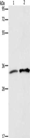 Gel: 8%SDS-PAGE, Lysate: 40 μg, Lane 1-2: Raw264.7 cells, human fetal liver tissue, Primary antibody: CSB-PA136137(ANXA4 Antibody) at dilution 1/400, Secondary antibody: Goat anti rabbit IgG at 1/8000 dilution, Exposure time: 3 seconds