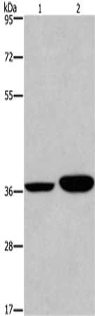 • Gel: 6%SDS-PAGE,Lysate: 40 μg,Lane 1-2: Hela cells, A549 cells,Primary antibody: CSB-PA229662(APAF1 Antibody) at dilution 1/350 dilution,Secondary antibody: Goat anti rabbit IgG at 1/8000 dilution,Exposure time: 5 minutes