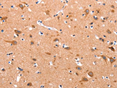 The image on the left is immunohistochemistry of paraffin-embedded Human brain tissue using CSB-PA783095(APAF1 Antibody) at dilution 1/30, on the right is treated with synthetic peptide. (Original magnification: ×200)