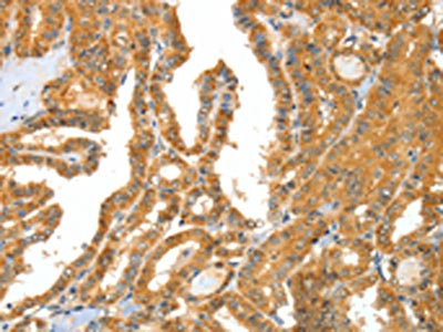 • The image on the left is immunohistochemistry of paraffin-embedded Human thyroid cancer tissue using CSB-PA780260(APOB Antibody) at dilution 1/15, on the right is treated with synthetic peptide. (Original magnification: ×200)