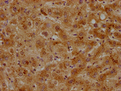 IHC image of CSB-PA001932OA01HU diluted at 1:500 and staining in paraffin-embedded human liver tissue performed on a Leica BondTM system. After dewaxing and hydration, antigen retrieval was mediated by high pressure in a citrate buffer (pH 6.0). Section was blocked with 10% normal goat serum 30min at RT. Then primary antibody (1% BSA) was incubated at 4°C overnight. The primary is detected by a biotinylated secondary antibody and visualized using an HRP conjugated SP system.