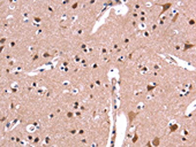 The image on the left is immunohistochemistry of paraffin-embedded Human brain tissue using CSB-PA906268(ARC Antibody) at dilution 1/50, on the right is treated with fusion protein. (Original magnification: ×200)