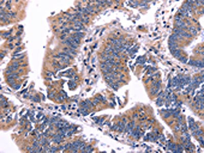 The image on the left is immunohistochemistry of paraffin-embedded Human colon cancer tissue using CSB-PA906268(ARC Antibody) at dilution 1/50, on the right is treated with fusion protein. (Original magnification: ×200)