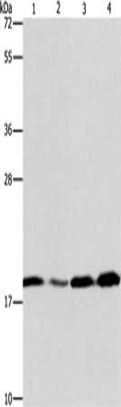 Gel: 10%SDS-PAGE, Lysate: 40 μg, Lane 1-4: A431 cells, human liver cancer tissue, 231 cells, human fetal liver tissue, Primary antibody: CSB-PA029843(ARF6 Antibody) at dilution 1/200, Secondary antibody: Goat anti rabbit IgG at 1/8000 dilution, Exposure time: 20 seconds