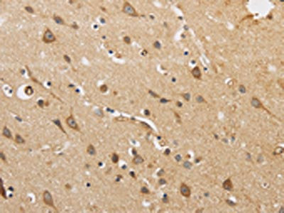 • The image on the left is immunohistochemistry of paraffin-embedded Human brain tissue using CSB-PA129669(ARF6 Antibody) at dilution 1/30, on the right is treated with synthetic peptide. (Original magnification: ×200)