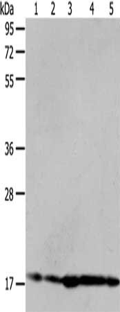 • Gel: 8%SDS-PAGE, Lysate: 40 μg, Lane 1-5: Hela cells, 293T cells, mouse liver tissue, A431 cells, MCF7 cells, Primary antibody: CSB-PA129669(ARF6 Antibody) at dilution 1/450, Secondary antibody: Goat anti rabbit IgG at 1/8000 dilution, Exposure time: 40 seconds