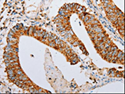 • The image on the left is immunohistochemistry of paraffin-embedded Human colon cancer tissue using CSB-PA088834(ARF6 Antibody) at dilution 1/15, on the right is treated with synthetic peptide. (Original magnification: ×200)