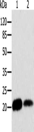• Gel: 12%SDS-PAGE, Lysate: 40 μg, Lane 1-2: HepG2 cells, 231 cells, Primary antibody: CSB-PA088834(ARF6 Antibody) at dilution 1/300, Secondary antibody: Goat anti rabbit IgG at 1/8000 dilution, Exposure time: 1 minute