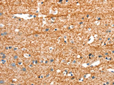 The image on the left is immunohistochemistry of paraffin-embedded Human brain tissue using CSB-PA906875(ARHGEF11 Antibody) at dilution 1/25, on the right is treated with synthetic peptide. (Original magnification: ×200)