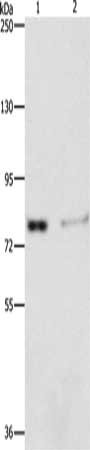 Gel: 10%SDS-PAGE, Lysate: 40 μg, Lane 1-2: Human fetal kidney tissue, 293T cells, Primary antibody: CSB-PA076840(ASAH2 Antibody) at dilution 1/240, Secondary antibody: Goat anti rabbit IgG at 1/8000 dilution, Exposure time: 5 minutes