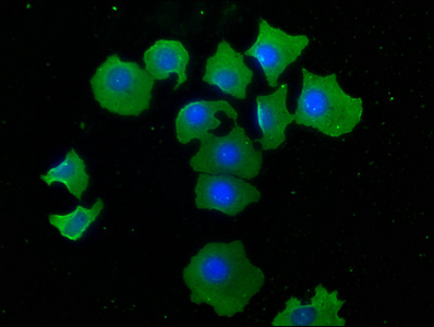 • Immunofluorescence staining of A549 cells with CSB-PA883590LA01HU at 1:50, counter-stained with DAPI. The cells were fixed in 4% formaldehyde, permeabilized using 0.2% Triton X-100 and blocked in 10% normal Goat Serum. The cells were then incubated with the antibody overnight at 4°C. The secondary antibody was Alexa Fluor 488-congugated AffiniPure Goat Anti-Rabbit IgG(H+L).