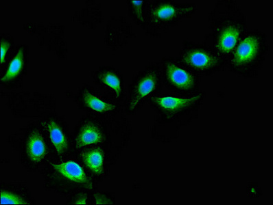 Immunofluorescent analysis of A549 cells using CSB-PA002290LA01HU at dilution of 1:100 and Alexa Fluor 488-congugated AffiniPure Goat Anti-Rabbit IgG(H+L)