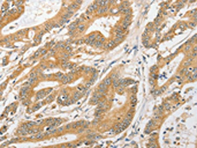 • The image on the left is immunohistochemistry of paraffin-embedded Human colon cancer tissue using CSB-PA931023(ATG5 Antibody) at dilution 1/40, on the right is treated with fusion protein. (Original magnification: ×200)