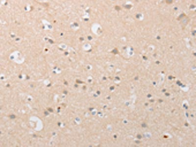 The image on the left is immunohistochemistry of paraffin-embedded Human brain tissue using CSB-PA868793(ATG9A Antibody) at dilution 1/40, on the right is treated with fusion protein. (Original magnification: ×200)
