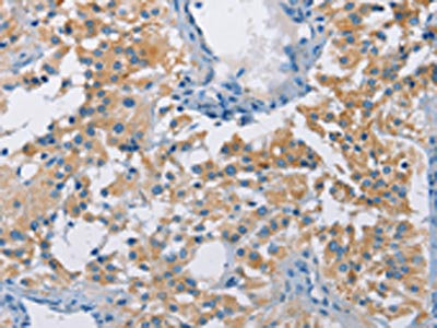 The image on the left is immunohistochemistry of paraffin-embedded Human thyroid cancer tissue using CSB-PA288252(ATP6AP2 Antibody) at dilution 1/40, on the right is treated with fusion protein. (Original magnification: ×200)