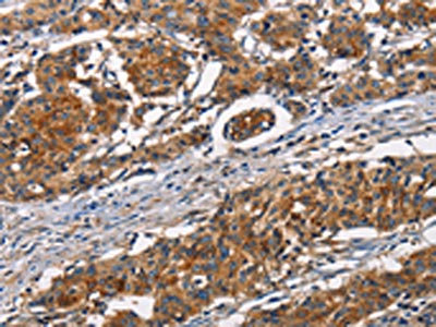 The image on the left is immunohistochemistry of paraffin-embedded Human gastic cancer tissue using CSB-PA904637(ATP7A Antibody) at dilution 1/50, on the right is treated with synthetic peptide. (Original magnification: ×200)
