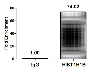 • Chromatin Immunoprecipitation Hela (4*106, treated with 30mM sodium butyrate for 4h) were treated with Micrococcal Nuclease, sonicated, and immunoprecipitated with 8µg anti-HIST1H1B (CSB-PA010377PA16acHU) or a control normal rabbit IgG. The resulting ChIP DNA was quantified using real-time PCR with primers against the β-Globin promoter.