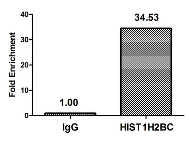 Chromatin Immunoprecipitation Hela (4*106, treated with 30mM sodium butyrate for 4h) were treated with Benzanase, sonicated, and immunoprecipitated with 5µg anti-HIST1H2BC (CSB-PA010403OA108acHU) or a control normal rabbit IgG. The resulting ChIP DNA was quantified using real-time PCR with primers against the β-Globin promoter.