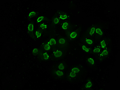 Immunofluorescence staining of Hela cells (treated with 30mM sodium butyrate for 4h) with CSB-PA010403OA108acHU at 1:2.5, counter-stained with DAPI. The cells were fixed in 4% formaldehyde, permeabilized using 0.2% Triton X-100 and blocked in 10% normal Goat Serum. The cells were then incubated with the antibody overnight at 4°C. The secondary antibody was Alexa Fluor 488-congugated AffiniPure Goat Anti-Rabbit IgG(H+L).