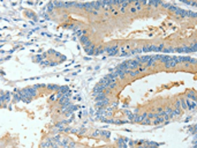 The image on the left is immunohistochemistry of paraffin-embedded Human colon cancer tissue using CSB-PA907155(BAAT Antibody) at dilution 1/30, on the right is treated with fusion protein. (Original magnification: ×200)