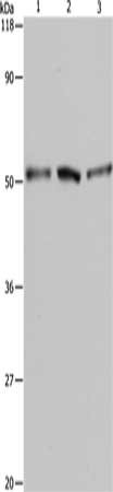 • Gel: 10%SDS-PAGE, Lysate: 40 μg, Lane 1-3: A549 cells, Hela cells, 293T cells, Primary antibody: CSB-PA438344(BAG5 Antibody) at dilution 1/500, Secondary antibody: Goat anti rabbit IgG at 1/8000 dilution, Exposure time: 1 minute