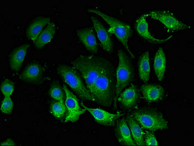 Immunofluorescent analysis of A549 cells using CSB-PA002550LA01HU at dilution of 1:100 and Alexa Fluor 488-congugated AffiniPure Goat Anti-Rabbit IgG(H+L)