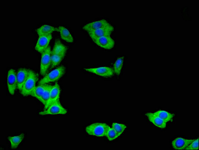 • Immunofluorescent analysis of HepG2 cells using CSB-PA530450LA01HU at dilution of 1:100 and Alexa Fluor 488-congugated AffiniPure Goat Anti-Rabbit IgG(H+L)
