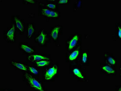 Immunofluorescence staining of Hela cells with CSB-PA03425A0Rb at 1:400, counter-stained with DAPI. The cells were fixed in 4% formaldehyde, permeabilized using 0.2% Triton X-100 and blocked in 10% normal Goat Serum. The cells were then incubated with the antibody overnight at 4°C. The secondary antibody was Alexa Fluor 488-congugated AffiniPure Goat Anti-Rabbit IgG(H+L).