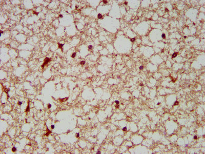 IHC image of CSB-PA002605LA01HU diluted at 1:200 and staining in paraffin-embedded human brain tissue performed on a Leica BondTM system. After dewaxing and hydration, antigen retrieval was mediated by high pressure in a citrate buffer (pH 6.0). Section was blocked with 10% normal goat serum 30min at RT. Then primary antibody (1% BSA) was incubated at 4°C overnight. The primary is detected by a biotinylated secondary antibody and visualized using an HRP conjugated SP system.