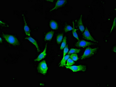 • Immunofluorescence staining of Hela cells with CSB-PA617917LA01HU at 1:133, counter-stained with DAPI. The cells were fixed in 4% formaldehyde, permeabilized using 0.2% Triton X-100 and blocked in 10% normal Goat Serum. The cells were then incubated with the antibody overnight at 4°C. The secondary antibody was Alexa Fluor 488-congugated AffiniPure Goat Anti-Rabbit IgG(H+L).