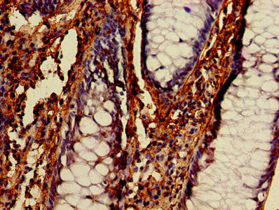 • IHC image of CSB-PA617917LA01HU diluted at 1:400 and staining in paraffin-embedded human colon cancer performed on a Leica BondTM system. After dewaxing and hydration, antigen retrieval was mediated by high pressure in a citrate buffer (pH 6.0). Section was blocked with 10% normal goat serum 30min at RT. Then primary antibody (1% BSA) was incubated at 4°C overnight. The primary is detected by a biotinylated secondary antibody and visualized using an HRP conjugated SP system.