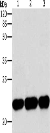 • Gel: 12%SDS-PAGE, Lysate: 30 μg, Lane 1-3: Human fetal brain tissue, HT29 cells, HepG2 cells, Primary antibody: CSB-PA225375(BID Antibody) at dilution 1/220, Secondary antibody: Goat anti rabbit IgG at 1/8000 dilution, Exposure time: 10 seconds