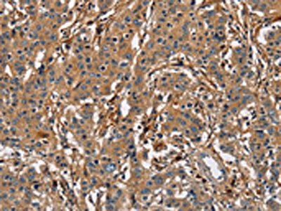 The image on the left is immunohistochemistry of paraffin-embedded Human gastric cancer tissue using CSB-PA237032(BLK Antibody) at dilution 1/20, on the right is treated with fusion protein. (Original magnification: ×200)