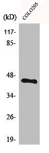 • Western Blot analysis of COLO205 cells using BMP-8A Polyclonal Antibody