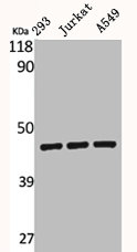 • Western Blot analysis of 293 Jurkat A549 cells using BMP-8A Polyclonal Antibody