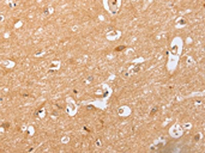 The image on the left is immunohistochemistry of paraffin-embedded Human brain tissue using CSB-PA796533(BST1 Antibody) at dilution 1/40, on the right is treated with synthetic peptide. (Original magnification: ×200)