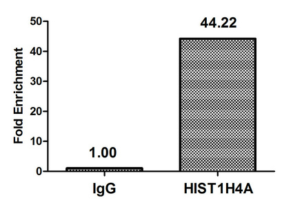 Chromatin Immunoprecipitation Hela (106, treated with 30mM sodium butyrate for 4h) were treated with Micrococcal Nuclease, sonicated, and immunoprecipitated with 5µg anti-HIST1H4A (CSB-PA010429OA12butHU) or a control normal rabbit IgG. The resulting ChIP DNA was quantified using real-time PCR with primers against the β-Globin promoter.