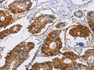 The image on the left is immunohistochemistry of paraffin-embedded Human colon cancer tissue using CSB-PA550152(CA9 Antibody) at dilution 1/40, on the right is treated with fusion protein. (Original magnification: ×200)