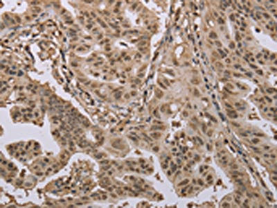 • The image on the left is immunohistochemistry of paraffin-embedded Human cervical cancer tissue using CSB-PA782755(CAB39 Antibody) at dilution 1/50, on the right is treated with synthetic peptide. (Original magnification: ×200)