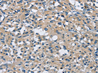 The image on the left is immunohistochemistry of paraffin-embedded Human thyroid cancer tissue using CSB-PA948042(CAB39L Antibody) at dilution 1/30, on the right is treated with fusion protein. (Original magnification: ×200)