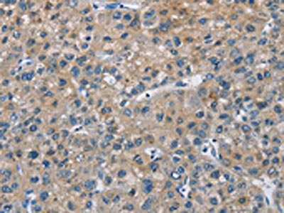 The image on the left is immunohistochemistry of paraffin-embedded Human liver cancer tissue using CSB-PA948042(CAB39L Antibody) at dilution 1/30, on the right is treated with fusion protein. (Original magnification: ×200)