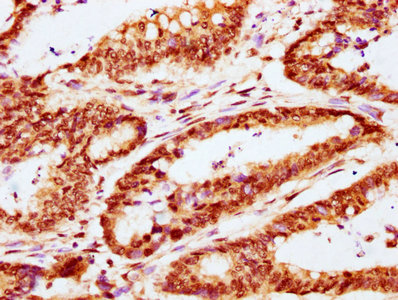 IHC image of CSB-PA23399A0Rb diluted at 1:400 and staining in paraffin-embedded human colon cancer performed on a Leica BondTM system. After dewaxing and hydration, antigen retrieval was mediated by high pressure in a citrate buffer (pH 6.0). Section was blocked with 10% normal goat serum 30min at RT. Then primary antibody (1% BSA) was incubated at 4°C overnight. The primary is detected by a biotinylated secondary antibody and visualized using an HRP conjugated SP system.