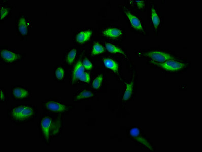 Immunofluorescent analysis of Hela cells using CSB-PA07867A0Rb at dilution of 1:100 and Alexa Fluor 488-congugated AffiniPure Goat Anti-Rabbit IgG(H+L)