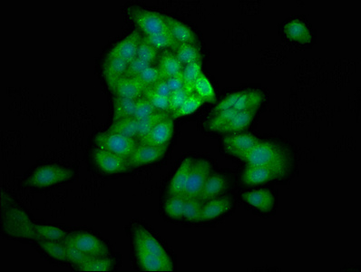 Immunofluorescence staining of HepG2 cells with CSB-PA838815LA01HU at 1:200, counter-stained with DAPI. The cells were fixed in 4% formaldehyde, permeabilized using 0.2% Triton X-100 and blocked in 10% normal Goat Serum. The cells were then incubated with the antibody overnight at 4°C. The secondary antibody was Alexa Fluor 488-congugated AffiniPure Goat Anti-Rabbit IgG(H+L).