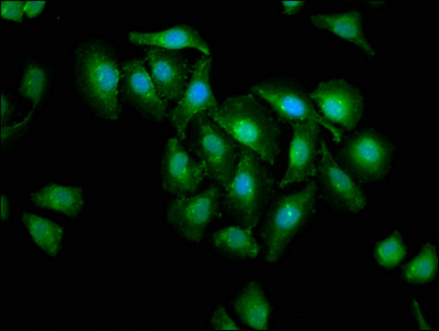Immunofluorescence staining of A549 cells with CSB-PA05689A0Rb at 1:200, counter-stained with DAPI. The cells were fixed in 4% formaldehyde, permeabilized using 0.2% Triton X-100 and blocked in 10% normal Goat Serum. The cells were then incubated with the antibody overnight at 4°C. The secondary antibody was Alexa Fluor 488-congugated AffiniPure Goat Anti-Rabbit IgG(H+L).