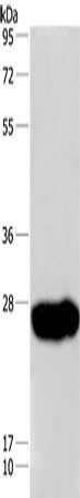 Gel: 10%SDS-PAGE, Lysate: 40 μg, Lane: Human fetal muscle tissue, Primary antibody: CSB-PA057927(CAV3 Antibody) at dilution 1/550, Secondary antibody: Goat anti rabbit IgG at 1/8000 dilution, Exposure time: 15 seconds